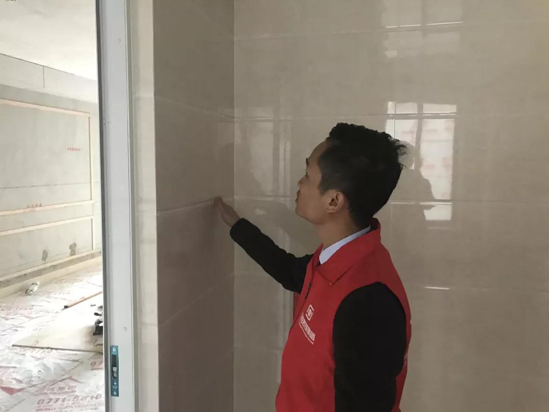 現(xiàn)場(chǎng)檢查是否按圖施工,檢查墻面鋪磚平整度
