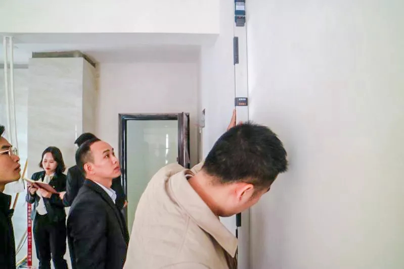 吳總與監(jiān)理部楊經(jīng)理在用靠尺檢驗墻面膩子工藝是否達標。