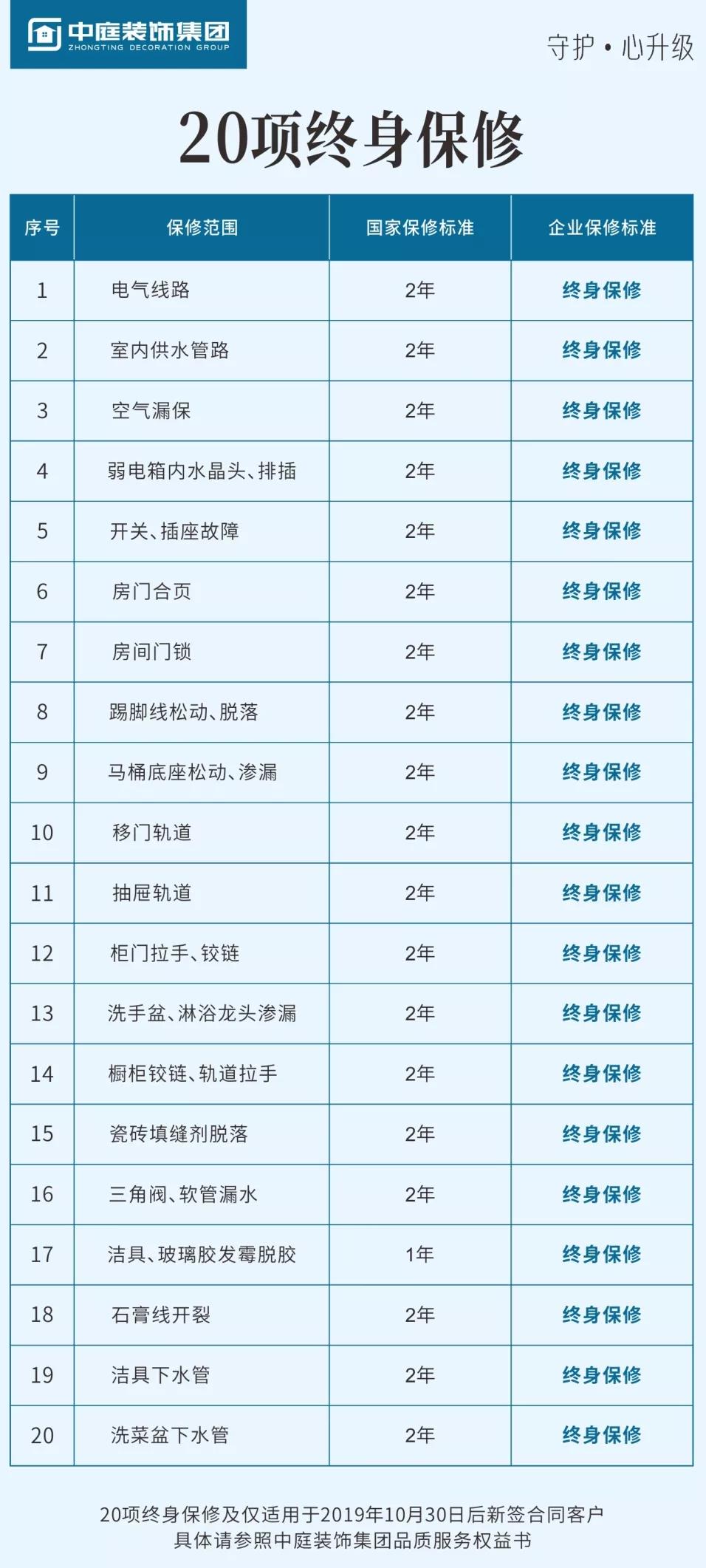 中庭裝飾集團20項終身保修上線,按照國家有關(guān)規(guī)定,保修標準為兩年的20項家裝工程,我們承諾終身保修!