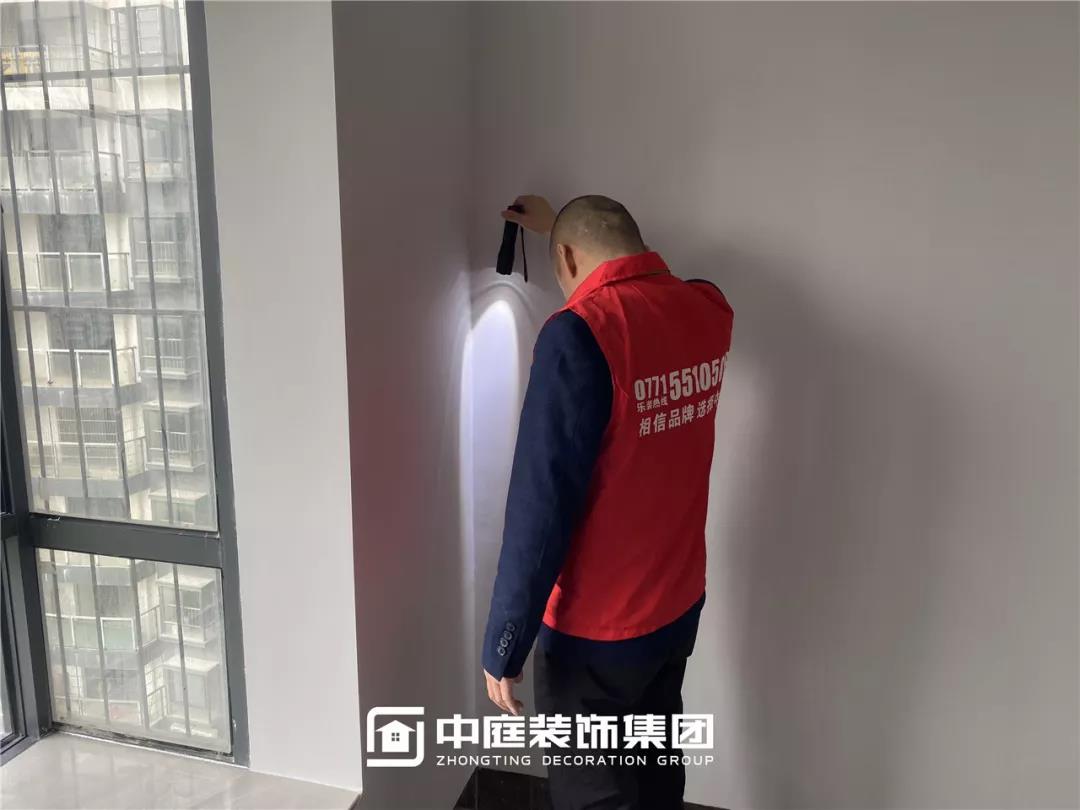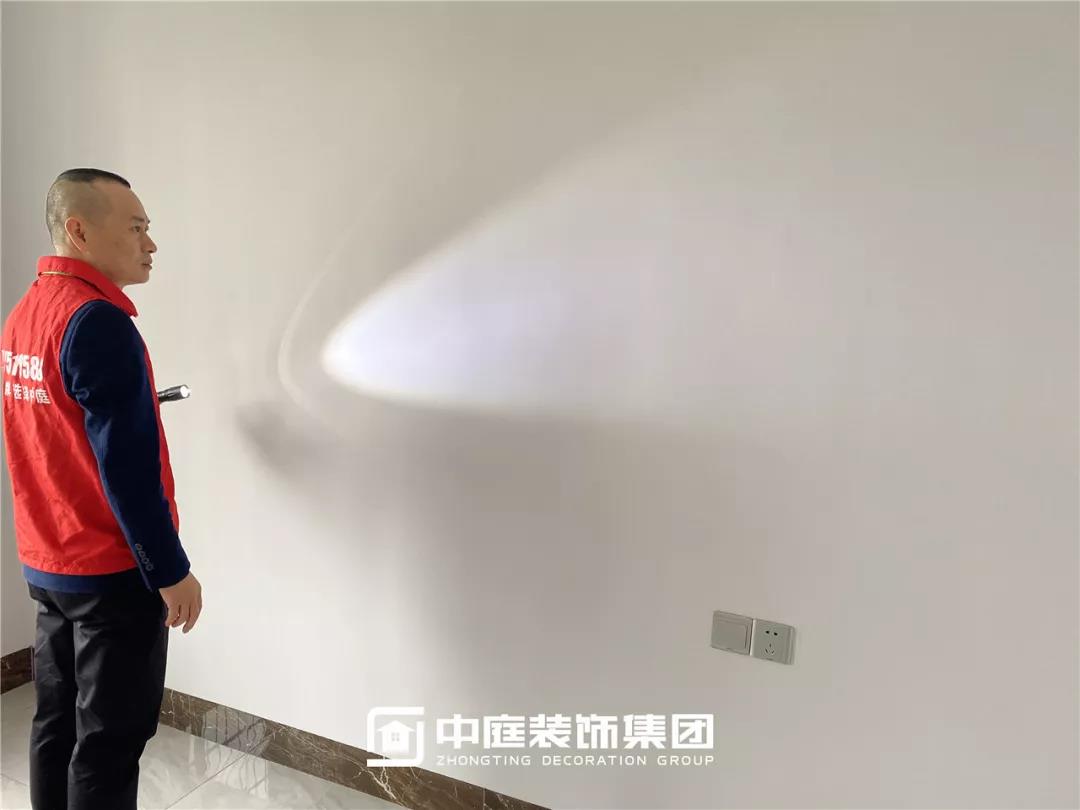 使用強(qiáng)光手電檢查墻面、陰角膩?zhàn)邮┕ご蚰デ闆r,施工是否達(dá)標(biāo)。
