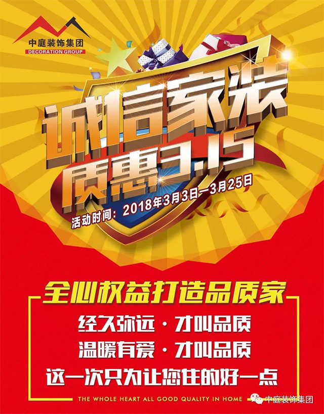 誠(chéng)信家裝,品質(zhì)宣言,我宣誓:誠(chéng)信中庭人,從我做起,我愿意遵守公司誠(chéng)信承諾,以客戶(hù)滿(mǎn)意為第一原則,讓百萬(wàn)家庭享受快樂(lè)裝修。誠(chéng)信315,在消費(fèi)陽(yáng)光下,中庭裝飾集團(tuán)向您鄭重承諾: