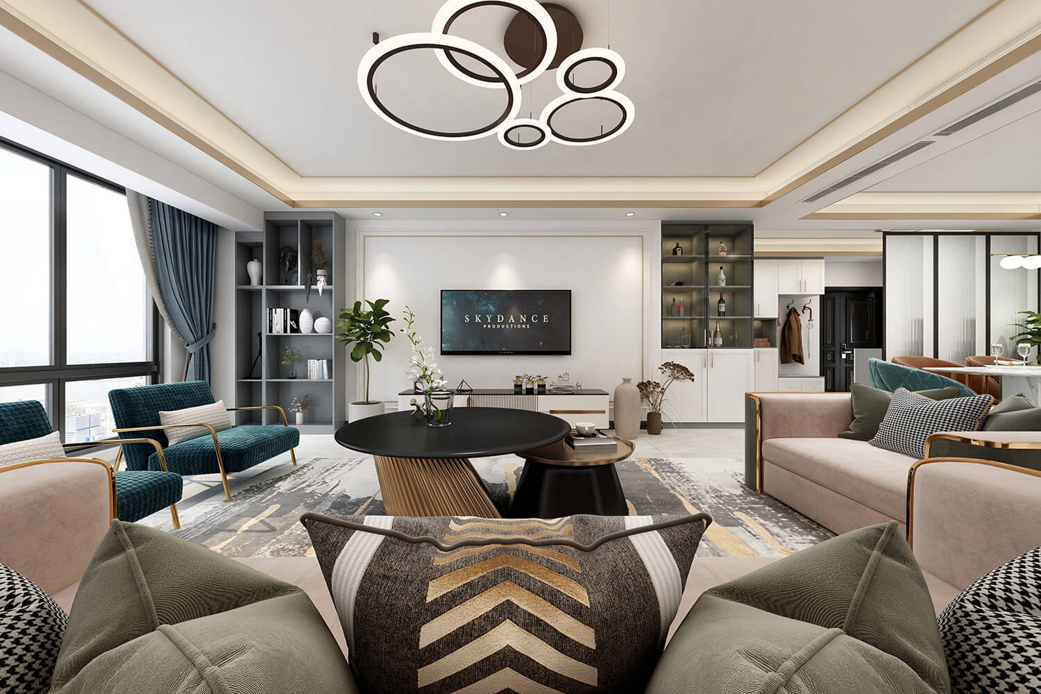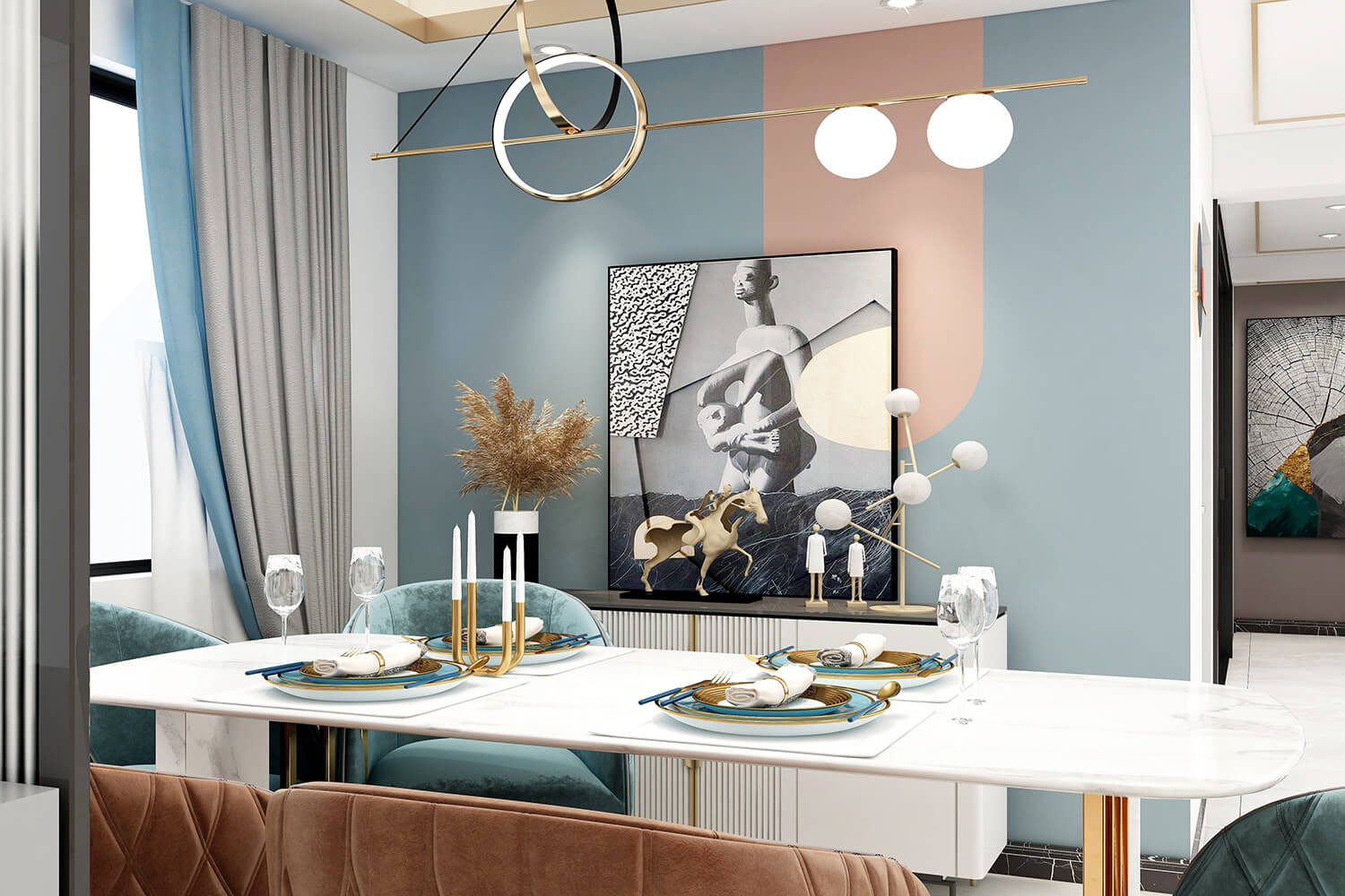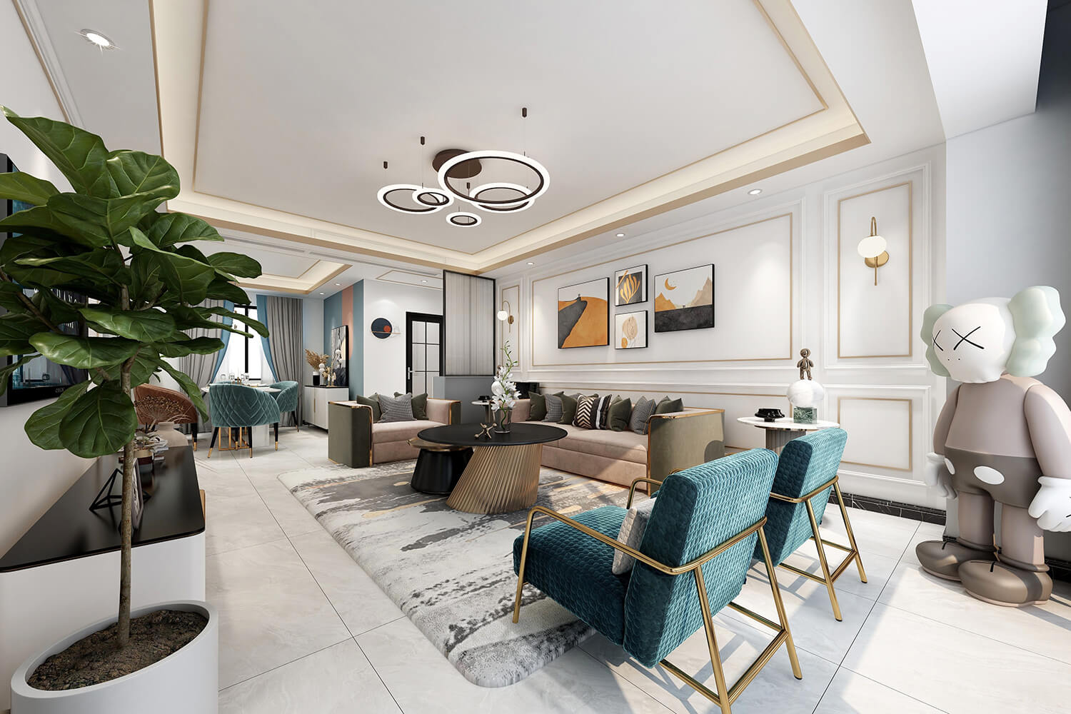 本案總面積118㎡,整體配色以白色為主色調(diào),用充滿清新氣息的綠與藍為空間帶來清爽感覺,點亮空間視覺色彩感知,展現(xiàn)別具一格的視覺感,華麗的金屬色澤增添輕奢質(zhì)感。