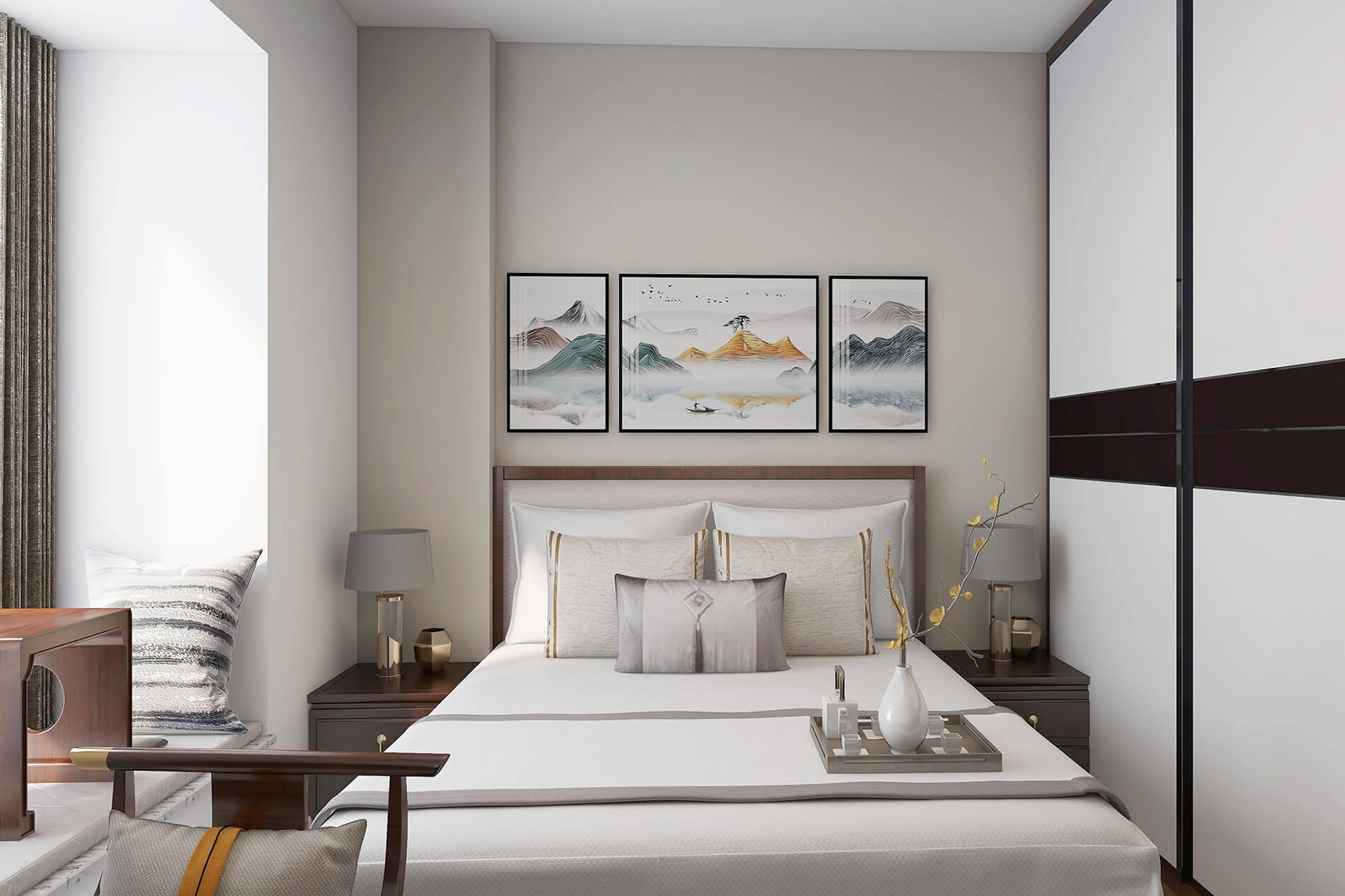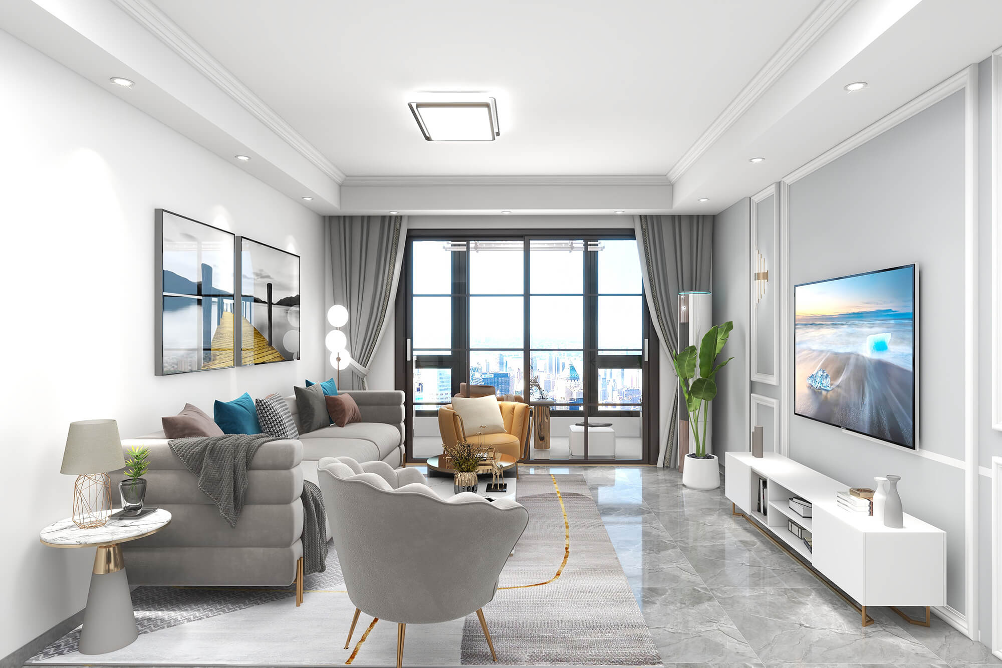 本戶型為:4房2廳1衛(wèi),總面積136㎡。設(shè)計(jì)師選用米灰色作為整體主色調(diào),整體簡(jiǎn)潔大氣,然后用現(xiàn)代簡(jiǎn)約家居點(diǎn)綴整個(gè)空間,讓空間沉穩(wěn)、寧?kù)o又不乏時(shí)尚感。