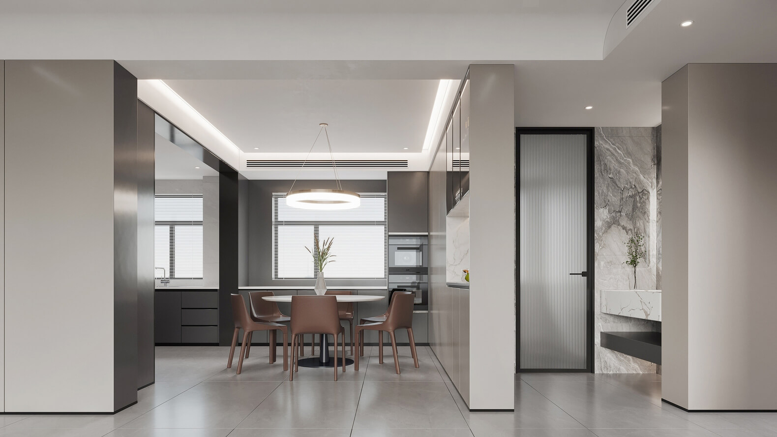 瀏覽量:781“灰”介于黑與白之間,它模糊著空間的絕對邊界,而“白”是開放,亦是隱藏、極簡。空間以灰和白作為主基調(diào),將自然、柔和、開放的各個(gè)功能板塊巧妙地融合,呈現(xiàn)一種清新典雅的高級感。