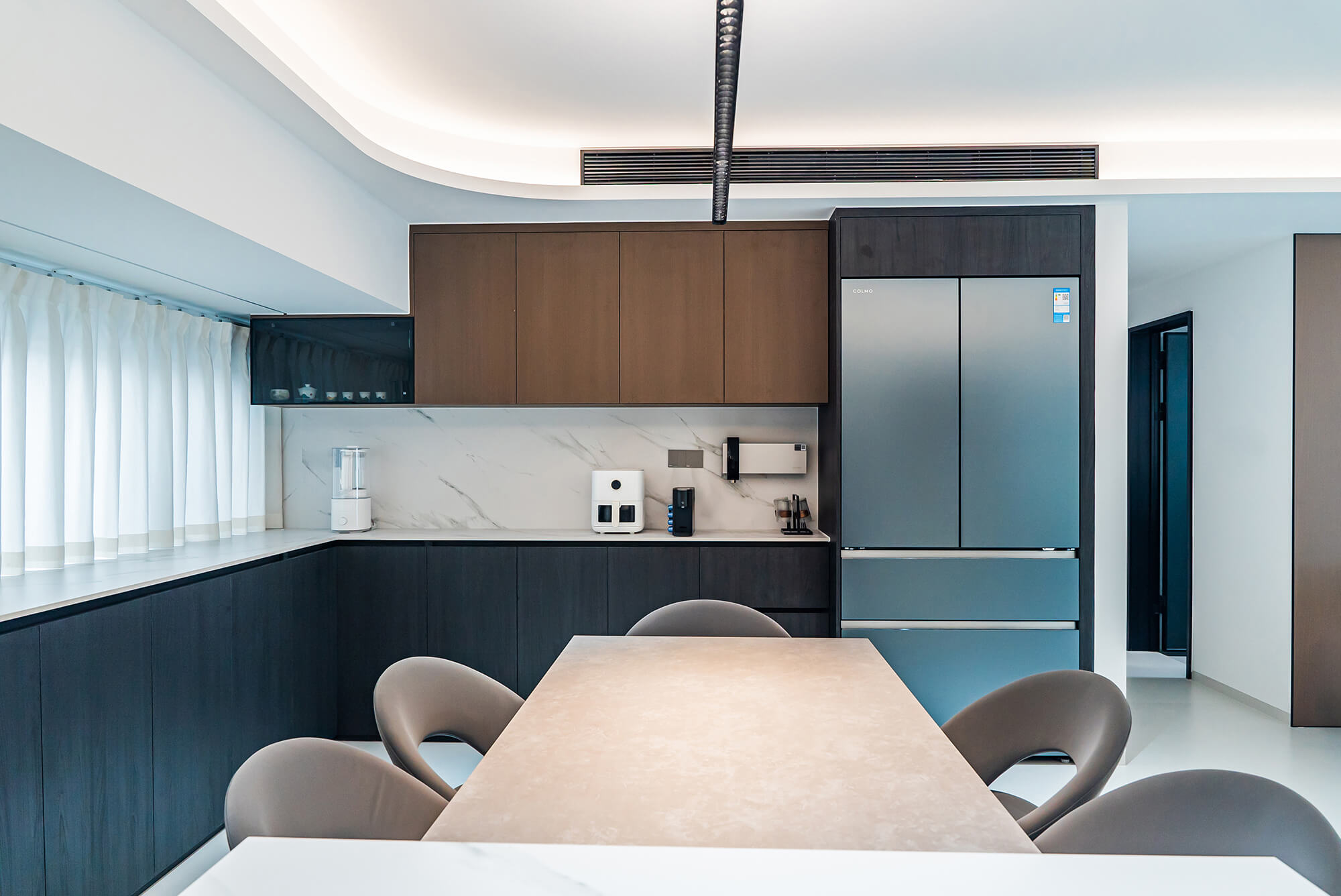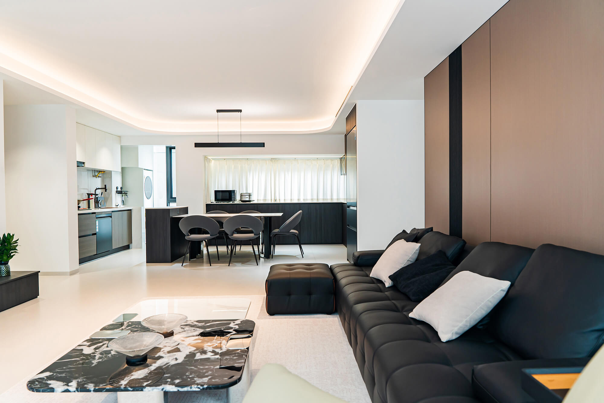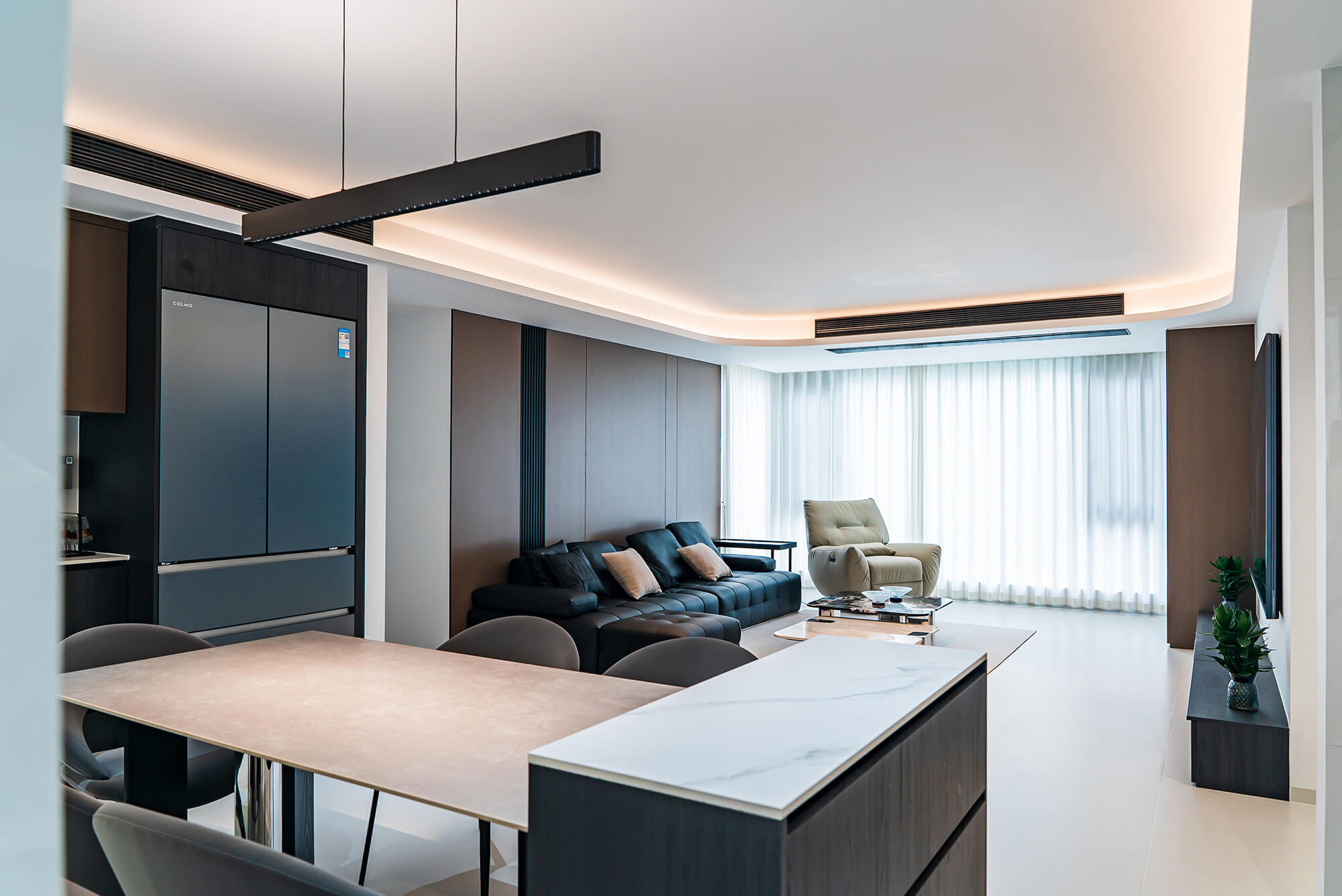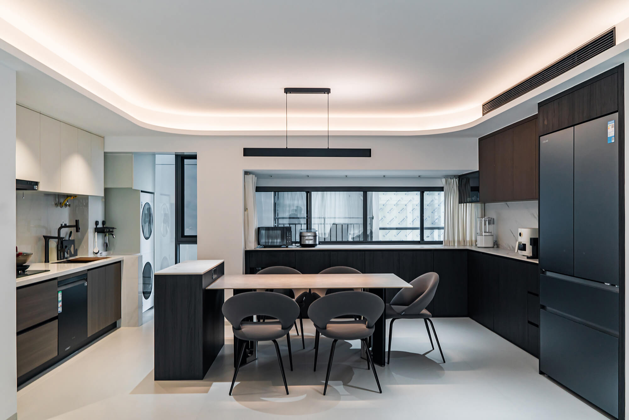 瀏覽量:219極致純粹的色彩美學(xué),以黑、白、灰三個基礎(chǔ)色構(gòu)建空間骨架,通過不同明度、材質(zhì)的層次對比(如啞光水泥、亮面巖板、磨砂金屬)豐富視覺。線條利落干脆,無多余裝飾,注重功能與結(jié)構(gòu)的統(tǒng)一性,打造冷靜、理性、富有高級質(zhì)感的極簡空間。