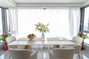 客餐廳采取一體化的設(shè)計(jì),通透寬敞視覺增加了整體空間的層次感,餐廳背景墻與客廳采用不同色調(diào)以及材質(zhì)的家具予以區(qū)分與以協(xié)調(diào),達(dá)成相輔相成之美。上方的蜿蜒燈盞猶如熱帶叢林的藤曼,座椅的顏色同色系著客廳的色彩,設(shè)計(jì)師得心應(yīng)手以材料與色彩營造空間氛圍。